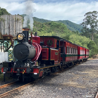 From Strahan I headed inland to NW Tasmania's largest settlement of Queenstown, which is truthfully still a small town that was once a much grander affair when it became the centre of a short-lived goldrush (two years...one major nugget!) and subsequently copper mining (which is responsible for the distinct discoloration of local rivers (as evidenced in the pic above), which will take another 100+ years to revert to a more natural colour). Following another 'Dhobey Run' (where the clothes dried with a distinctly "eau de fumée" scent due to the pervasive bush fires that had been burning in the region since my departure from Corinna), I booked a seat on the principal tourist attraction here: the West Coat Wilderness Railway. They have superbly restored three or so late 19C steam trains and run a tourist/passenger service as far as Regatta Point (Strahan) some 35km away. The trip I took, however, was the Rinadeena Climb, where these unique trains had been fitted with a very clever german-designed rack and pinion centre track rail system (centre pic above) that enable them to climb/descend a 1:16 gradient (which may not seem much, but 'normal' trains are more used to managing inclines of 1:400 to 1:2000!).